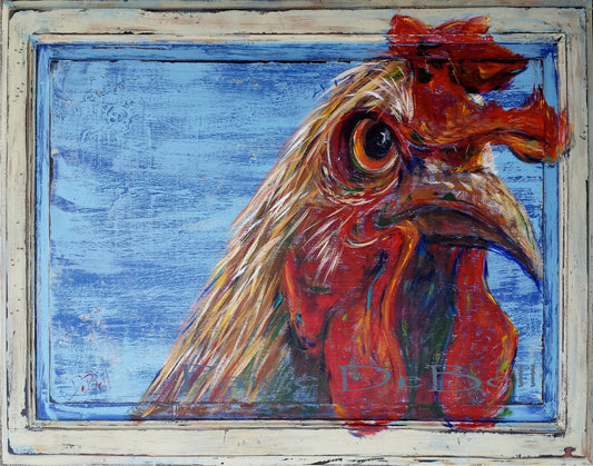 ANGRY ROOSTER** 11" x14" Print of Original Rooster painting by NOLA artist Paige DeBell. Art on architectural salvage and Katrina wood.