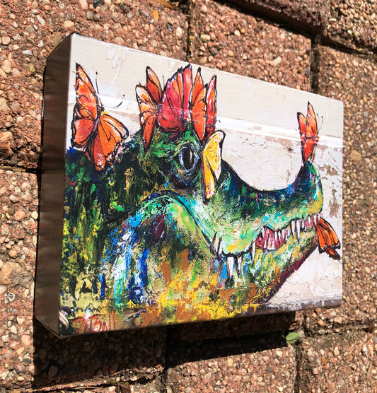 ALLIGATOR and BUTTERFLIES * 5x7 Stretched Canvas Giclee of my original painting by New Orleans artist, Paige DeBell on Architectural Salvage
