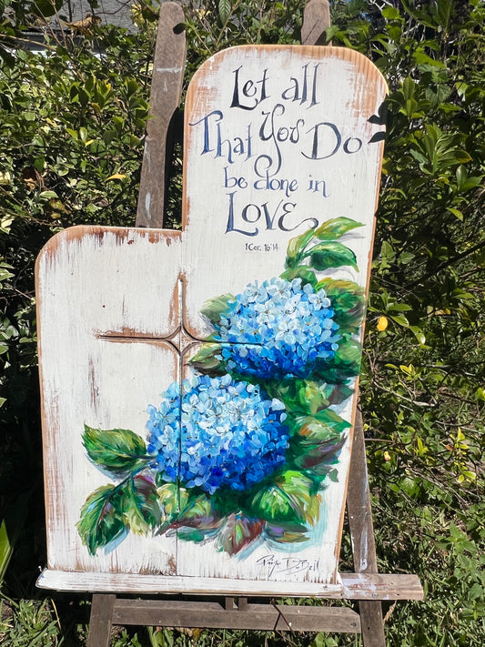 Blue HYDRANGEAS on Salvaged CHURCH PEW – Faith-Inspired Wall Art, Southern Home Decor, Inspirational Quote- Paige DeBell Art