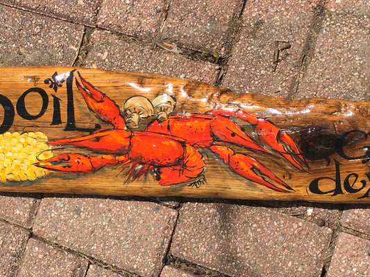 CRAWFISH BOIL PAINTING on a Large piece of Driftwood from the Mississippi River by Paige DeBell, New Orleans artist