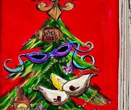 New Orleans PAINTED CHRISTMAS TREE**Decorated with whimsical Nola Ornaments in a Salvaged wood frame** Cajun Christmas artwork 36 x 22