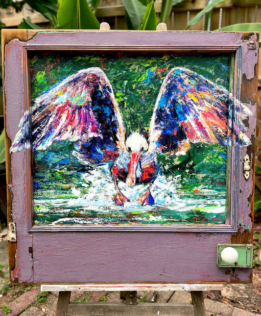 PELICAN LIFT-OFF Painting **Large Pelican Painting in Architectural Salvage** 36 x 36