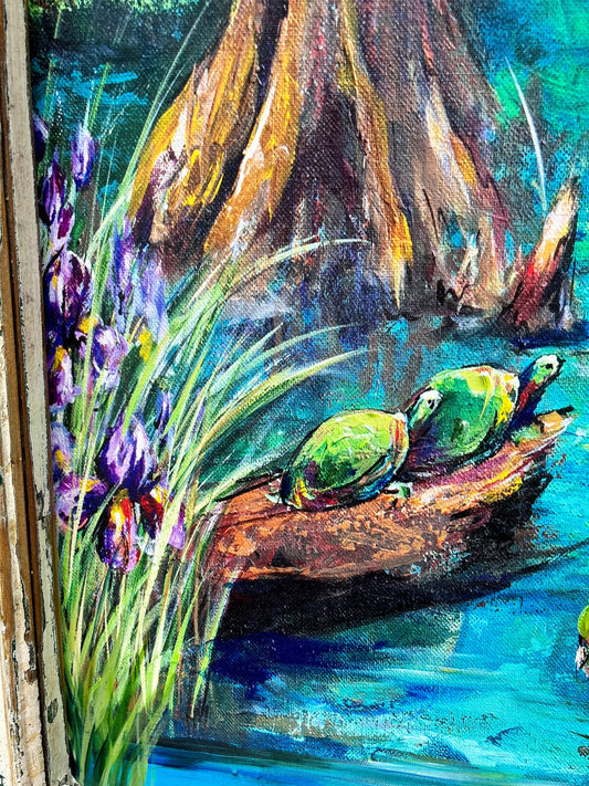 GATOR BAYOU Large Painting **Reclaimed Wood Frame* 46x32 ** Louisiana Swamp Painting