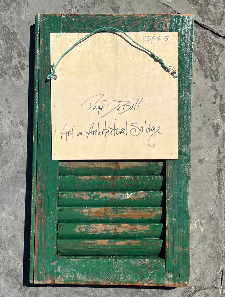 An original acrylic composition capturing a Blue Heron in its natural hunting habitat among marsh grasses. The artwork is mounted on wood and framed with an authentic cypress shutter salvaged from New Orleans architecture, retaining traces of vintage "French Quarter Green" paint and warm amber patina. Measuring 25.5" x 15", this piece is part of a curated series utilizing reclaimed architectural elements from storm-affected homes in the Lower Ninth Ward. Each work is hand-signed, professionally sealed, and arrives ready for display. A distinctive fusion of contemporary wildlife art and historical preservation by New Orleans-based artist Paige DeBell.